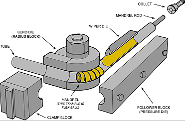 Mandrel bending is a method of rotary draw bending, a solid mandrel shaft with up to five segmented shaped balls are inserted up the inside of the tube that is being bent. These mandrel are slightly smaller than the inside diameter of the tube and provide internal support during bending. Fitting a mandrel inside of the tube prevents damage such as distortion, collapsing, rippling, and flattening.